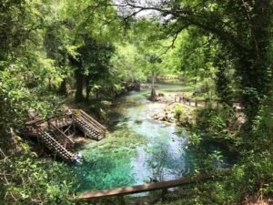 Falmouth Spring is one of North Florida’s most surreal, underrated natural sanctuaries — a hidden bowl of shimmering teal water tucked beneath massive oaks and draping vines. The spring behaves like a “tidal breath”: sometimes full, sometimes mysteriously empty, revealing its limestone architecture like an ancient temple basin carved into the earth.